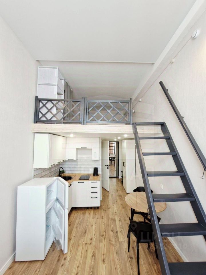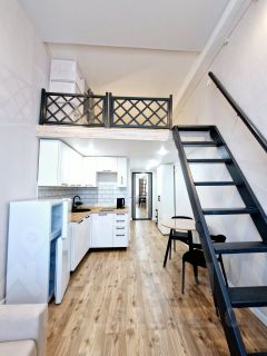 Уютная студия с мебелью и техникой.