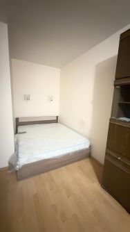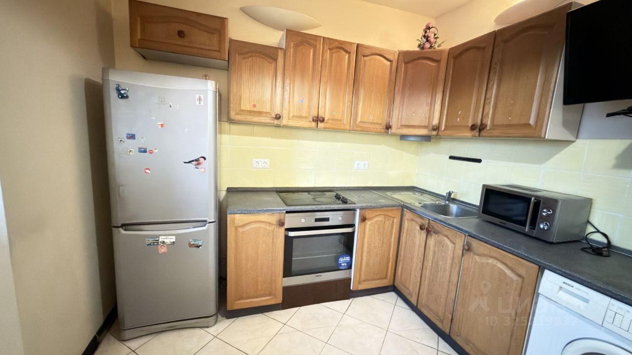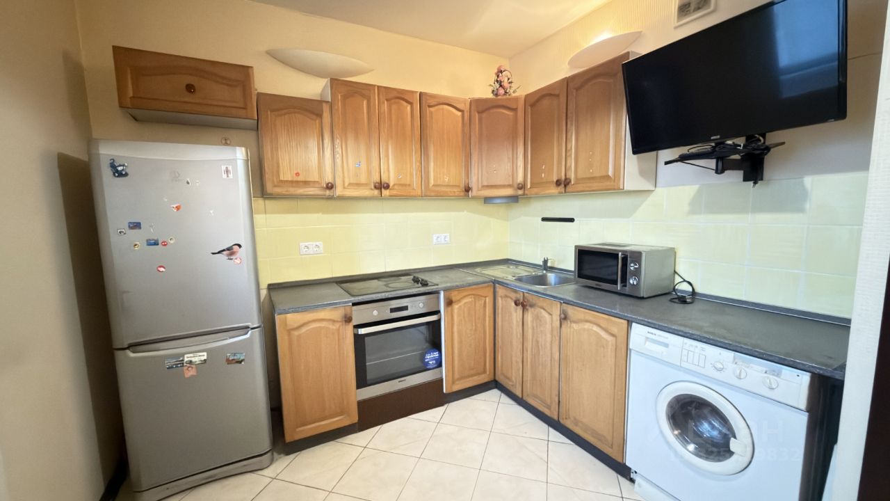 В квартире: кухонный гарнитур, стол, стиральная машина, холодильник, стенка в комнате, шкаф в прихожей, новая двуспальная кровать с новым матрасом(160 на 200 см). Санузел совмещенный, с ванной. Балкон застеклен, с выходом из кухни. Окна во двор.