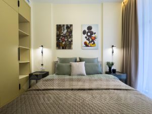 - кухонная зона оборудована необходимой бытовой техникой: варочная панель, духовая печь, свч, посудомоечная машина, вытяжка, сушилка для посуды. Мягкая подсветка кухни и необходимый инвентарь позволит сделать процесс кулинарного творчества более приятным. Обеденный стол сервирован на 4 персоны, что позволит принимать трапезы с гостями;