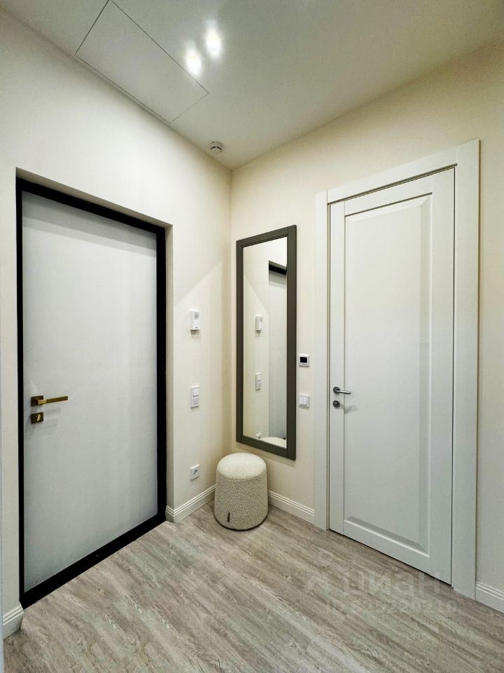 - прихожая зона имеет полноразмерное зеркало, пуфик, шкафчик для принадлежностей;