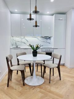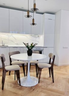 Кухня полностью укомплектована (холодильник, морозильная камера, варочная панель, духовой шкаф, посудомоечная машина, вытяжка, свч и эл. чайник)