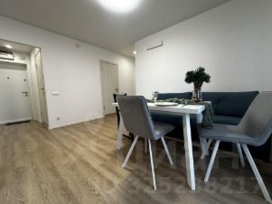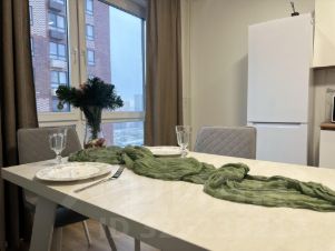 Сдается светлая двухкомнатная квартира с евро ремонтом на 19 этаже нового панельного дома 2023 года постройки. В квартире изолированные комнаты, что обеспечивает комфорт и приватность. Просторная кухня площадью 17 м² оборудована необходимой техникой, включая холодильник и стиральную машину. В гостиной установлен удобный диван и обеденный стол, а также имеется кабельное/цифровое ТВ. В спальне — большая кровать и вместительный шкаф. В прихожей предусмотрены удобные шкафы для хранения вещей. Санузел раздельный, выполнен в современном стиле. В квартире есть все необходимое для комфортного проживания: мебель, бытовая техника и интернет. Дом оснащен двумя пассажирскими лифтами и одним грузовым, что обеспечивает удобство перемещения. Для автомобилей предусмотрена подземная парковка. Курение запрещено, но можно проживать с детьми и животными.