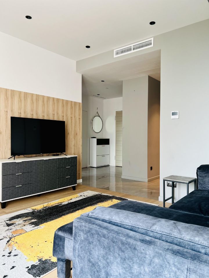 Апартамент с дизайнерским ремонтом, полностью меблирован и оборудован современной техникой (холодильник, телевизор, стиральная машина, варочная панель, посудомоечная машина) и системой кондиционирования.