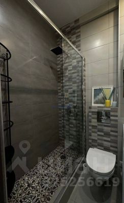 Душевая с тропическим душем, полка Икеа, полотенцесушитель. На окнах жалюзи блэкаут.