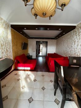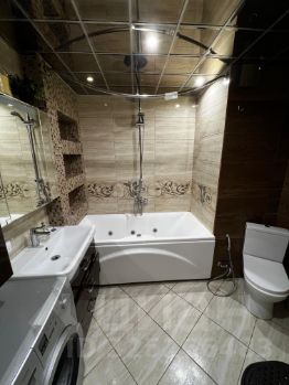 Внутри квартиры вас ждет уютная обстановка: просторная жилая площадь в 55 кв. м, кухня 10 кв. м с современной мебелью и техникой. В квартире есть холодильник, посудомоечная машина, телевизор и стиральная машина. Планировка включает одну лоджию и один балкон, окна выходят во двор, что обеспечивает тишину и уют. Санузел совмещенный и оборудован ванной.