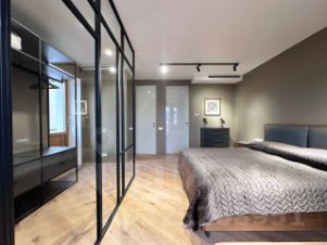 Продуманная планировка. Спальня с остекленной гардеробной - 22 м. Кабинет 16 м со своим выходом на террасу, диваном и стеллажами. Кухня и гостиная около 58 м объединены с коридором в одно большое пространство. Два санузла: десятиметровый с окном, ванной и душевой кабиной, и второй на четыре метра с душевой. Отдельная постирочная с системой хранения, стиральной и сушильной машинами и технической мойкой для сильно загрязненных вещей. Кухня полностью укомплектована техникой и посудой. Телевизор 75 дюймов уже на месте. По всей квартире бесшумная сплит система, интернет МГТС заведён, тариф выбираете сами. Курить можно только на террасе, где оборудованы три комфортные зоны с комфортной мебелью.