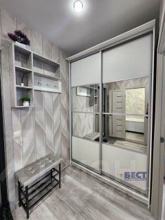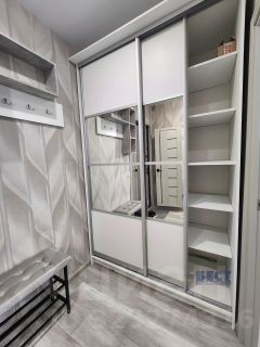 В прихожей большой встроенный шкаф для одежды и функциональные, глубокие полки.