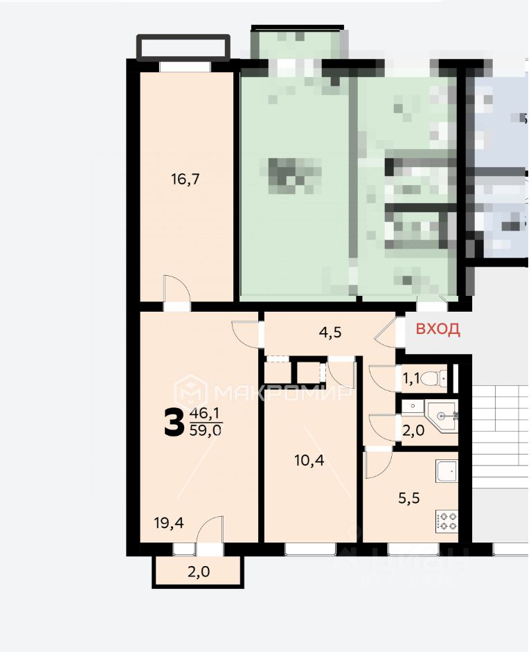 • Просторная смежная комната (19,4 кв.м.)