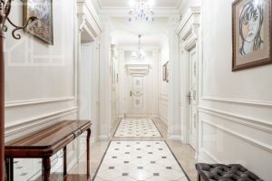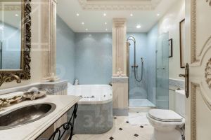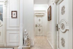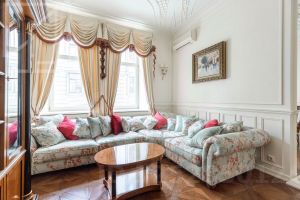 Планировка: просторная гостиная-столовая, кухня с обеденной зоной, две спальни, жилая комната (можно использовать как спальню или кабинет), совмещенный санузел с ванной и душевой кабиной, гостевой санузел, гардеробная, прихожая. Квартира меблирована, укомплектована всей необходимой для жизни бытовой техникой. Выполнен авторский ремонт с использованием дорогих материалов в классическом стиле.