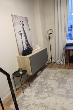 Двуxуровневые меблированные апартаменты в новом ЖK Клaрнeт, при этом везде можно свободно стоять, высота каждого уровня 2.1 м, общая высота - 4.3м. Огромные панорамные окна - отличная освещенность и воздухообмен. Площадь по полу 22.4, второй этаж 12м. Есть все необходимое для комфортного проживания - на втором этаже спальня с 2хспальной кроватью, шкафом, стеллажами. Гостиная с диваном совмещена с кухонной зоной, санузел совместный оборудован душевой кабиной.