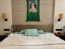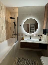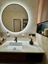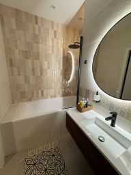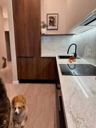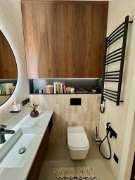 Техника: варочная панель, духовой шкаф, холодильник, посудомоечная машина, стиральная машина, сушильная машина, кондиционер, телевизор со смарт-тв диагональю 75 дюймов (!) в гостиной и 40 дюймов в спальне