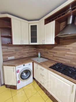 Кухня: кухонный гарнитур, газовая панель, без духовки, вытяжка, двухкамерный холодильник, стиральная машина, стол, стулья.