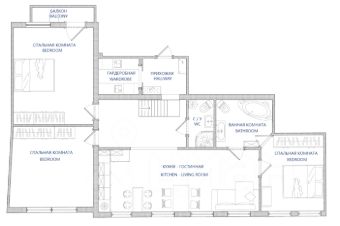 Есть вся необходимая для проживания мебель. Удобные кровати, широкие вместительные шкафы, рабочие зоны. В одной из комнат есть возможность на свой вкус обустроить детскую, кабинет, спальную.