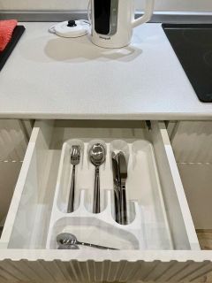 Кухонный уголок оборудован всем необходимым для приготовления пищи: плита, холодильник, микроволновая печь и кухонная утварь.