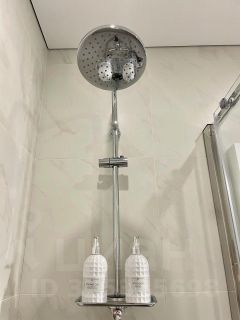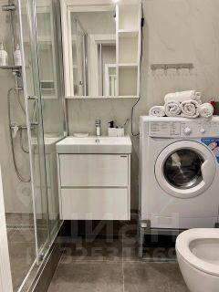 Ванная комната оснащена просторной душевой кабиной с тропическим душем, раковиной и стиральной машиной
