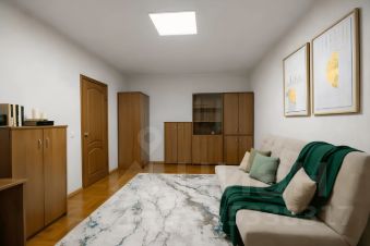 - продуманное зонирование: в комнате много воздуха. Есть зона отдыха с большим диваном, вместительные шкафы и выделенное рабочее место у окна — удобно для удаленки или личных дел;