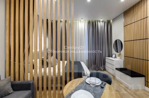 Квартира находится на 8 этаже. Панорамное остекление во всю стену, дизайнерский ремонт, продуманная планировка, много систем хранения, 2 спальных места.