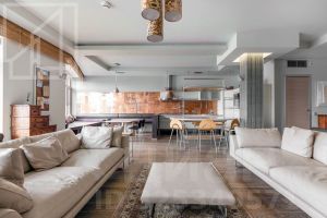 Планировка: просторная кухня-гостиная с обеденной зоной, две спальни, жилая комната (можно использовать как спальню или кабинет), два совмещенных санузла с ванной и душевой кабиной, гардеробная комната, гостевой санузел с душевой кабиной, постирочная, прихожая. Квартира меблирована, укомплектована необходимой бытовой техникой. Потолки 3.3 м. Ремонт в уникальном авторском стиле.
