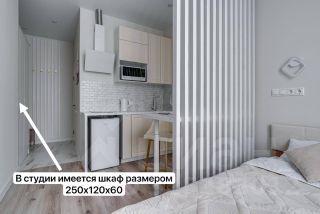 Сделан дизайнерский ремонт, что создает атмосферу уюта и стиля. Студия полностью меблирована: большой шкаф для хранения (250х120х60) с различными отсеками для хранения, кровать с подьемным механизмом, полноценная кухня. Из техники — кондиционер, холодильник, посудомойка, телевизор и стиральная машина.