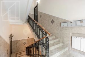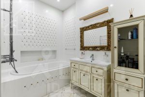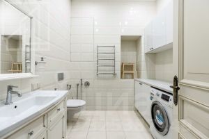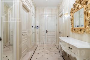 Планировка: угловая гостиная-столовая-кухня с тремя окнами, основная спальня с двумя окнами, 2 спальни, большая ванная комната с ванной и душем, второй санузел, холл. Окна выходят в тихий внутренний двор. в квартире представлена мебель испанского бренда Modenese-Gastone. Кухня оснащена встроенной техникой Bosch, сантехника бренда Jacob Delafon.