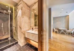 Оборудован современной итальянской мебелью, всей необходимой техникой и электроникой. Система климат - контроль, умный дом, бесплатный Wi-Fi, шторы, стиральная машина, ТВ, утюг, сушка, гладильная доска. Наличие всей необходимой посуды.