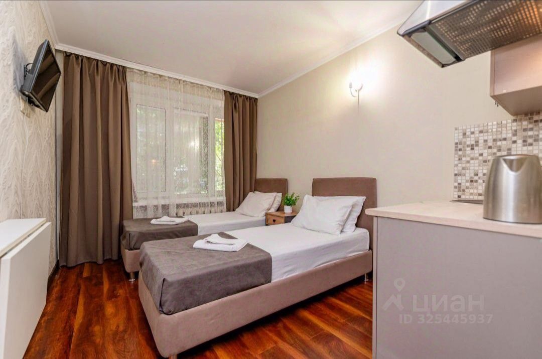 Двухместная студия со своим санузлом, душем и кухней. Холодильник, плитка для приготовления еды, вся необходимая посуда, телевизор и вай-фай. Кровати размером 80Х200. Для семейных пар кровати можно соединить. Чай, кофе, сахар в номере есть. Для увеличения пространства обеденный стол можно поднять или опустить.