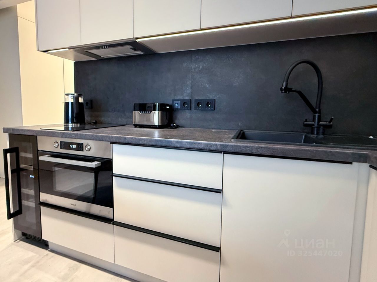 Кухня: Полный комплект встроенной техники премиум-класса: варочная панель, духовой шкаф с функцией микроволновки, мощная вытяжка, винный шкаф, холодильник, посудомоечная машина, а также измельчитель отходов в мойке.