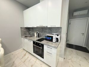 В апартаментах имеются: холодильник, посудомоечная машина, варочная панель, микроволновая печь, чайник, кофемашина. Также есть утюг с гладильной доской, фен, полный комплект посуды. Апартаменты сдаются "под ключ".