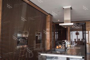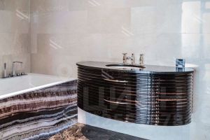 Напольное покрытие из массива американского ореха (LIC USA) придаёт помещению стильный вид, а элементы отделки из натурального оникса добавляют изысканности.