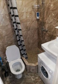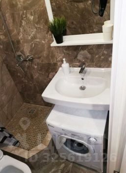 Современная ванная комната с душевой кабиной, феном и стиральной машиной.