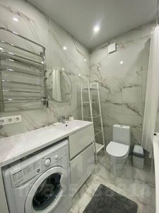 Квартира оборудована всем необходимым для комфортного проживания: двуспальная кровать, диван, оборудованная кухонная зона с бытовой техникой, собственная ванная комната и туалет.