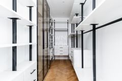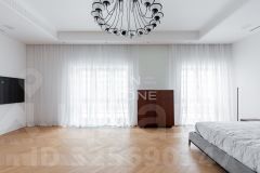 1 этаж: Гостиная с вторым светом (высота 6 м), совмещенная с кухней; прихожая; 2 мастер-спальни с гардеробными и ванными; дополнительная гардеробная и санузел.
