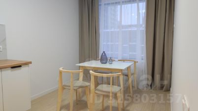 Кухня оборудованная кухонным гарнитуром с достаточным местом для хранения, в спокойных цветах. На кухне имеется встроенный двухкамерный холодильник, встроенная стиральная машина, духовой шкаф и электро плинта на 2 конфорки, небольшой стол, 4 мягких стула и кондиционер.