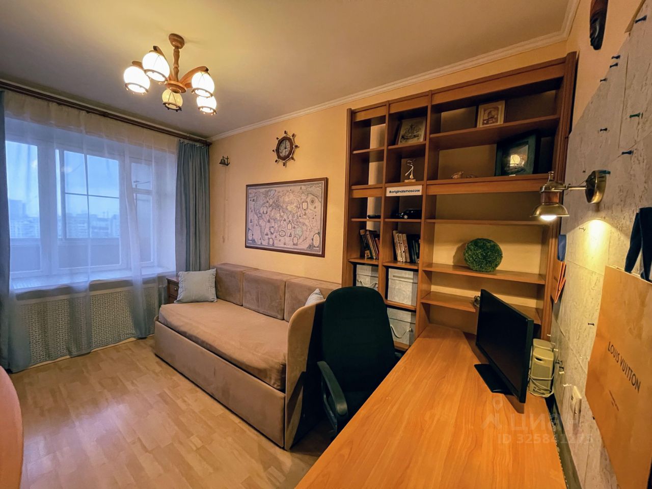 Маленькая комната оформлена в морском стиле для ребенка, хороший ортопедический матрас, большой письменный стол, много ящиков и полок. Можно использовать как кабинет.