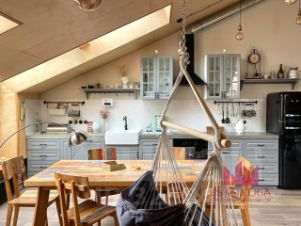 Планировка продумана для современного образа жизни. На первом уровне расположена гостиная и большая кухня, оборудованная техникой SMEG. Отдельная спальня и дополнительная уединенная спальная зона на втором уровне обеспечивают приватность. Вас ждут два современных санузла (с душевой кабиной и ванной), а также большая гардеробная. Отделка выполнена с безупречным вкусом: дубовый пол, качественные материалы и инженерные коммуникации, сантехника Villeroy & Boch, 18 итальянских окон Velux с видами на звёзды. Объект полностью укомплектован всей необходимой мебелью и техникой, включая кондиционер, посудомоечную машину, стиральную машину и высокоскоростной интернет. Окна выходят во двор, очень тихо, отличная шумоизоляция.