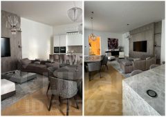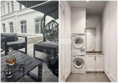 Интерьер выполнен в стиле городской классики с акцентом на натуральные материалы: дубовый паркет, мрамор Luna Grey Honed в ванных, смесители Gessi, сантехника Villeroy & Boch. Главный акцент — приватная терраса площадью 40 м² с подогревом, выходящая во внутренний благоустроенный двор.
