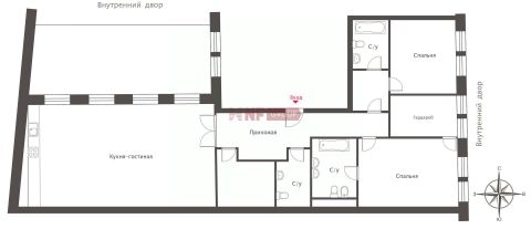 Планировка: просторная кухня-гостиная, мастер-спальня с гардеробной и ванной, вторая спальня с ванной, постирочная, гостевой санузел и холл.