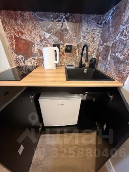 В студии выполнен дизайнерский ремонт, который придаёт интерьеру стильный и современный вид. Квартира полностью меблирована: есть мебель на кухне и в комнате. Кухня площадью 5 кв. м оснащена всем необходимым: есть холодильник и телевизор. В ванной комнате установлена душевая кабина.