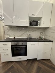 кухня со встроенной техникой (духовой шкаф, варочная панель, микроволновая печь, холодильник)
