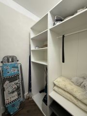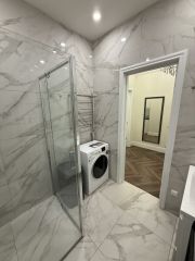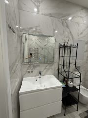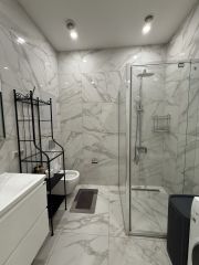 Санузел выполнен в современном стиле: душевая кабина, качественная сантехника, продуманное хранение.