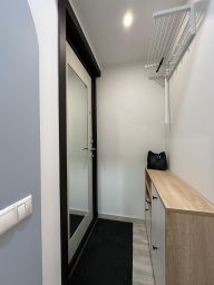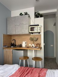 Студия для 2 гостей. Спальные места: кровать с ортопедическим матрасом. В студии есть мини-кухня, холодильник, микроволновка, плита, чайник, посуда, фен, утюг, полотенца, постельное белье, душевая система с тропическим душем. Стиральная машина в общем коридоре.