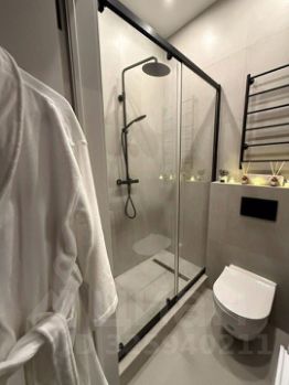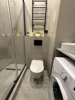 В ванной душевая с стеклянной перегородкой, мощная стиральная машина на 6 кг с функцией стирки паром.