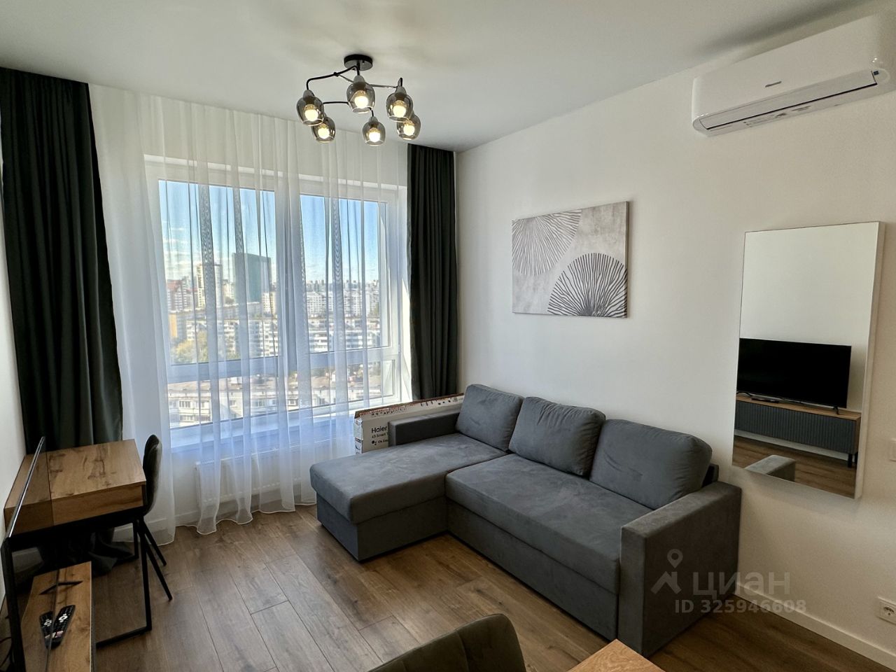 Есть кондиционер, за зеркалом/ящиком в зале гладильная доска.
