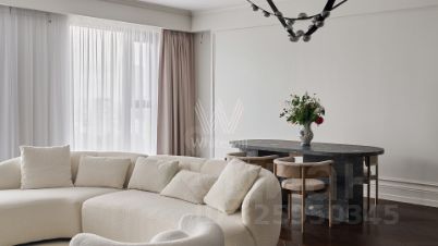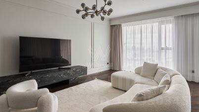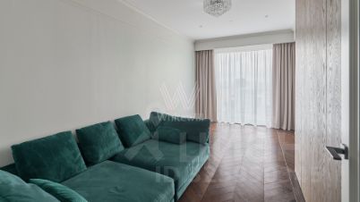 Видовые апартаменты с 2-мя спальнями в премиальном комплексе "Поклонная, 9" рядом с Парком Победы. Выполнен дизайнерский ремонт в современном стиле, интерьер оформлен в лаконичных светлых тонах. В отделке использованы материалы премиум-класса, натуральный камень, мрамор, на полу уложен паркет из дерева. Благодаря панорамным окнам и высоким потолкам пространство наполнено естественным светом, открываются живописные виды на город и "Москва-Сити".