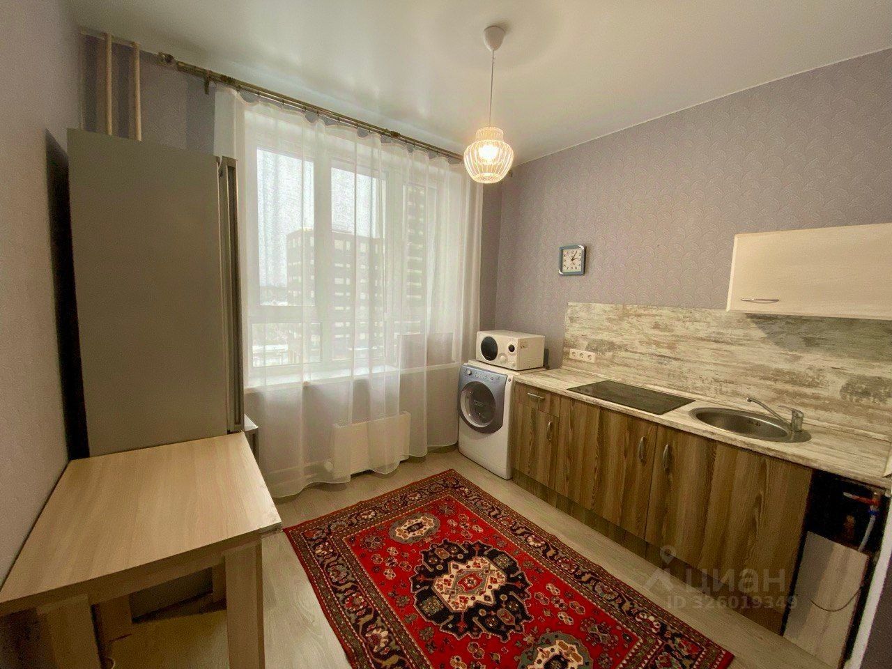 Полностью оборудованная кухня: стиральная машина, холодильник, электрическая плита, микроволновая печь.