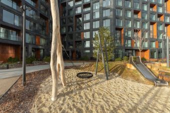 Современный дом 2024 года постройки со стильным лобби, зонами для прогулок, собственным катком и спортивными площадкам, внутренним двором без машин и красивым ландшафтным дизайном.
