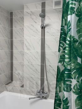 Идеальный санузел: Ванная комната выполнена в стильной плитке до самого потолка, что придает ей элегантный вид и облегчает уборку.