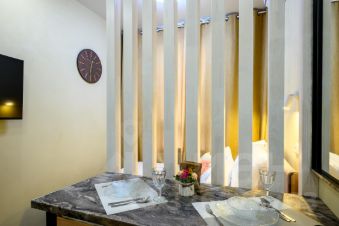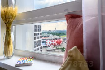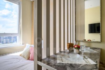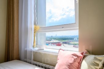 Студия очень светлая, эргономичный дизайнерский ремонт. Апартаменты находятся на 21 этаже, что исключает пыль и присутствие мошкары, а также гарантирует отсутствие шума. Окна выходят на зеленый двор и стадион, за которым видна река. В студии потолки более 3 метров!
