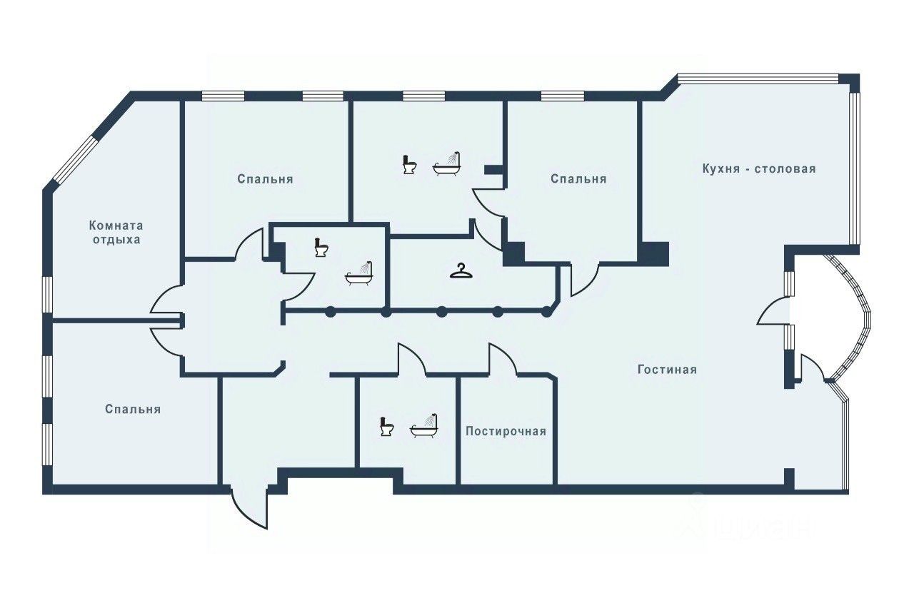 Функциональная планировка: четыре изолированные комнаты-спальни, большая гостиная, кухня, гардеробная, три ванные комнаты, лоджия, балкон.