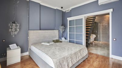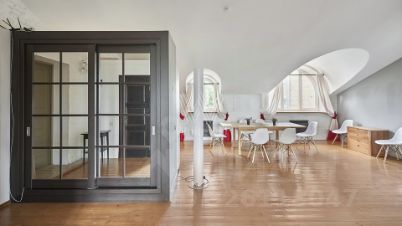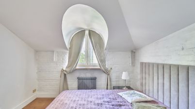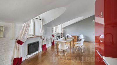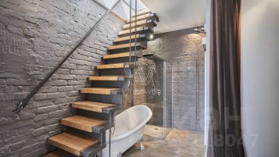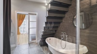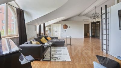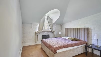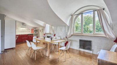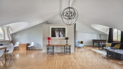 Выполнен дизайнерский ремонт в стиле "лофт", в отделке использовано натуральное дерево и светлая кирпичная кладка. Благодаря большому количеству мансардных и панорамных окон пространство наполнено светом.